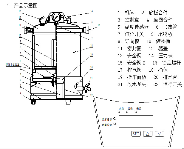 “水位”指示燈:通電后,在桶內(nèi)沒(méi)有水(或水位低于保護(hù)低水位)時(shí)該燈亮,顯為紅色,同時(shí)機(jī)內(nèi)蜂鳴器鳴叫;當(dāng)桶內(nèi)的水位高于低水位時(shí),指示燈轉(zhuǎn)為綠色,可以進(jìn)入加熱狀態(tài)。但是,這并非表示桶內(nèi)的水量可以滿足整個(gè)滅菌程序的需要。滅菌起始水位一定要按示意圖的要求加到規(guī)定的位置。