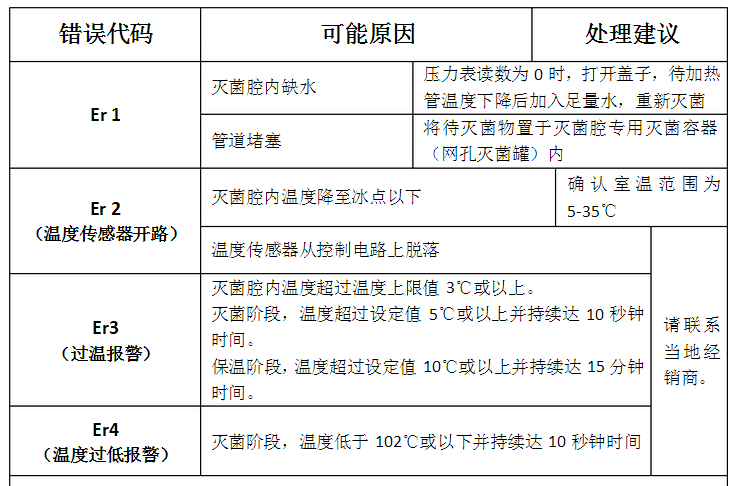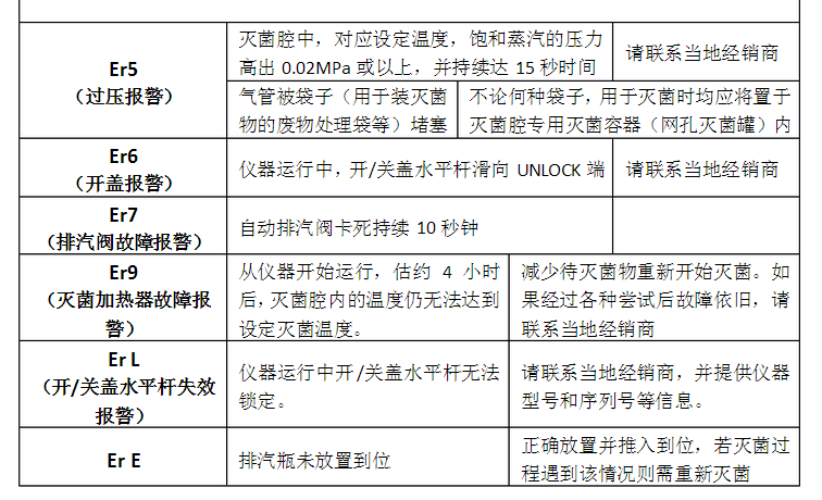 功能異常時,錯誤檢測電路將觸發(fā)以確保安全。電路激活時,錯誤代碼在顯示屏顯示并聲音報警。按START/STOP鍵可停止報警聲。報警情況發(fā)生時,檢查錯誤代碼,并關閉儀器電源。