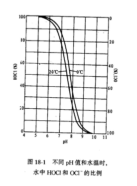 HOCl和OCl-的比例與水中溫度和pH有關(guān)。pH高時(shí),OCl-較多。 pH>9,OCl-接近100%。 pH<6,HOCl接近100%。