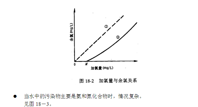 余氯:出廠水接觸30分后余氯不低于0.3mg/L;在管網(wǎng)末梢不應(yīng)低于0.05mg/L。 加氯曲線: ? 水中無任何微生物、有機(jī)物等,加氯量=余氯,圖18-2中的① ? 水中有機(jī)物較少時(shí),需氯量滿足以后就是余氯。圖18-2中的②
