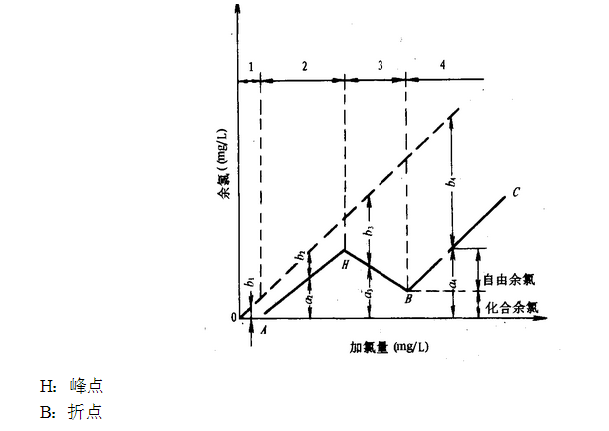 HB段:仍然是化合性余氯,加氯量繼續(xù)增加,氯氨被氧化成不起消毒作用的化合物,余氯反而減少。