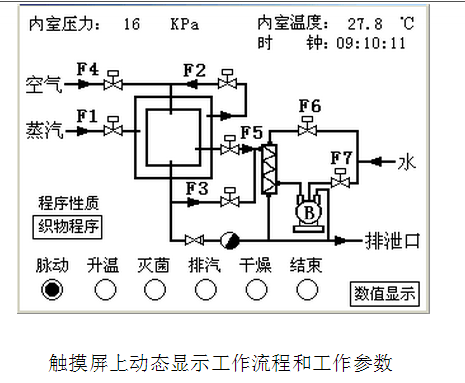 菌過程的溫度、壓力、時間、過程階段、預(yù)置參數(shù)等均在觸摸屏顯示器中自動顯示并可以隨時儲存,并配有微型打印機進行打印工作過程參數(shù)以便于歸檔、備查。此外,該控制系統(tǒng)配備有一套完整的自測及校正程序,可以實現(xiàn)不同海拔高度下、不同地區(qū)的壓力、溫度等參數(shù)的校正;還具有多級控制保護、幫助功能。