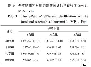 各實(shí)驗(yàn)組和對(duì)照組高速裂鉆的扭轉(zhuǎn)強(qiáng)度計(jì)算結(jié)果見(jiàn)表3,如表3示:和對(duì)照組相比,隨著滅菌次數(shù)的增加,干熱滅菌法、化學(xué)浸泡法和濕熱滅菌法組內(nèi)裂鉆的扭轉(zhuǎn)強(qiáng)度均逐漸減小。不同處理方法之間的比較顯示,在處理5次和10次時(shí),干熱處理、化學(xué)浸泡和濕熱處理3種處理方法之間兩兩比較,扭轉(zhuǎn)強(qiáng)度的差異均有統(tǒng)計(jì)學(xué)意義(P<0.05);在處理15次時(shí),化學(xué)浸泡和干熱處理引起的扭轉(zhuǎn)強(qiáng)度的差異無(wú)統(tǒng)計(jì)學(xué)意義,而濕熱處理組與化學(xué)浸泡和干熱處理組之間的差別均有統(tǒng)計(jì)學(xué)意義(P<0.05)。干熱滅菌法和化學(xué)浸泡法對(duì)裂鉆扭轉(zhuǎn)強(qiáng)度的影響相同且弱于濕熱滅菌法。