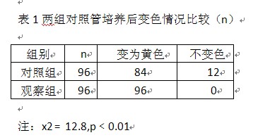 2.1兩組對(duì)照管經(jīng)培養(yǎng)后變色情況比較見表1